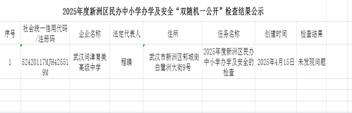 我局于2025年4月15日发起的“民办中小学办学及安全“双随机、一公开”工作任务,目前检查工作已结束,现将此次检查结果公示如下:(检查结果见附表)