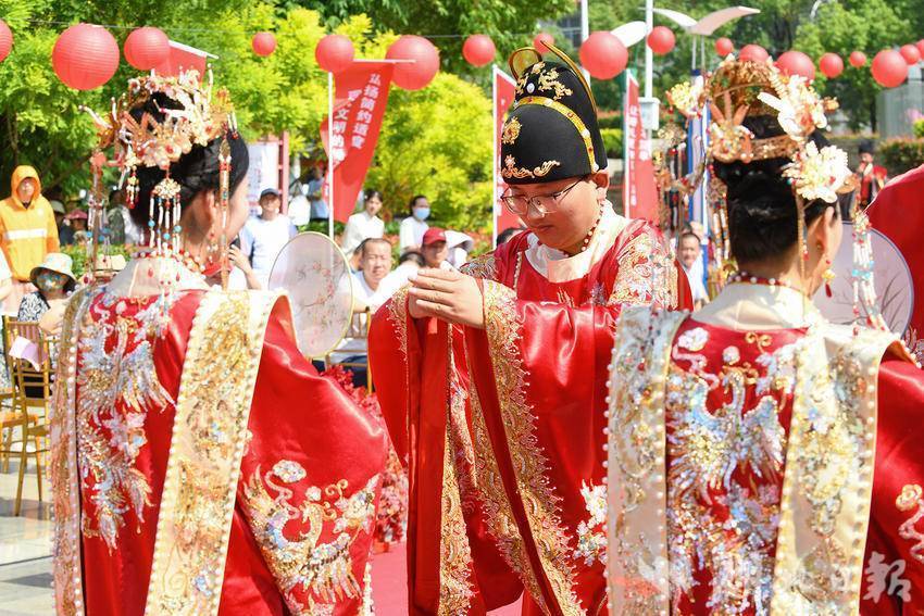 “今日各府联姻,缔结百年之好,以六礼之制,行婚典之仪,现吉时已到,诸位宾朋,击掌喜迎,新郎,隆登华堂!”集体婚礼现场,红毯铺地,曲奏笙歌。20对新人身着精美的传统中式喜服,缓步走上红毯。婚典以“古风汉婚”形式集体举行,在司仪的指引下,新郎依次登上华堂,在他们正对面的新娘则手执寓意美满幸福的团扇走出花阁。行却扇礼、共牵红巾、共入华堂、礼谢众宾、礼赞官传古训、行执手之礼、送同心结……40位伉俪、20对新人在鲜花、掌声和亲友的祝福声中大婚礼成,许下相伴一生的美好诺言。